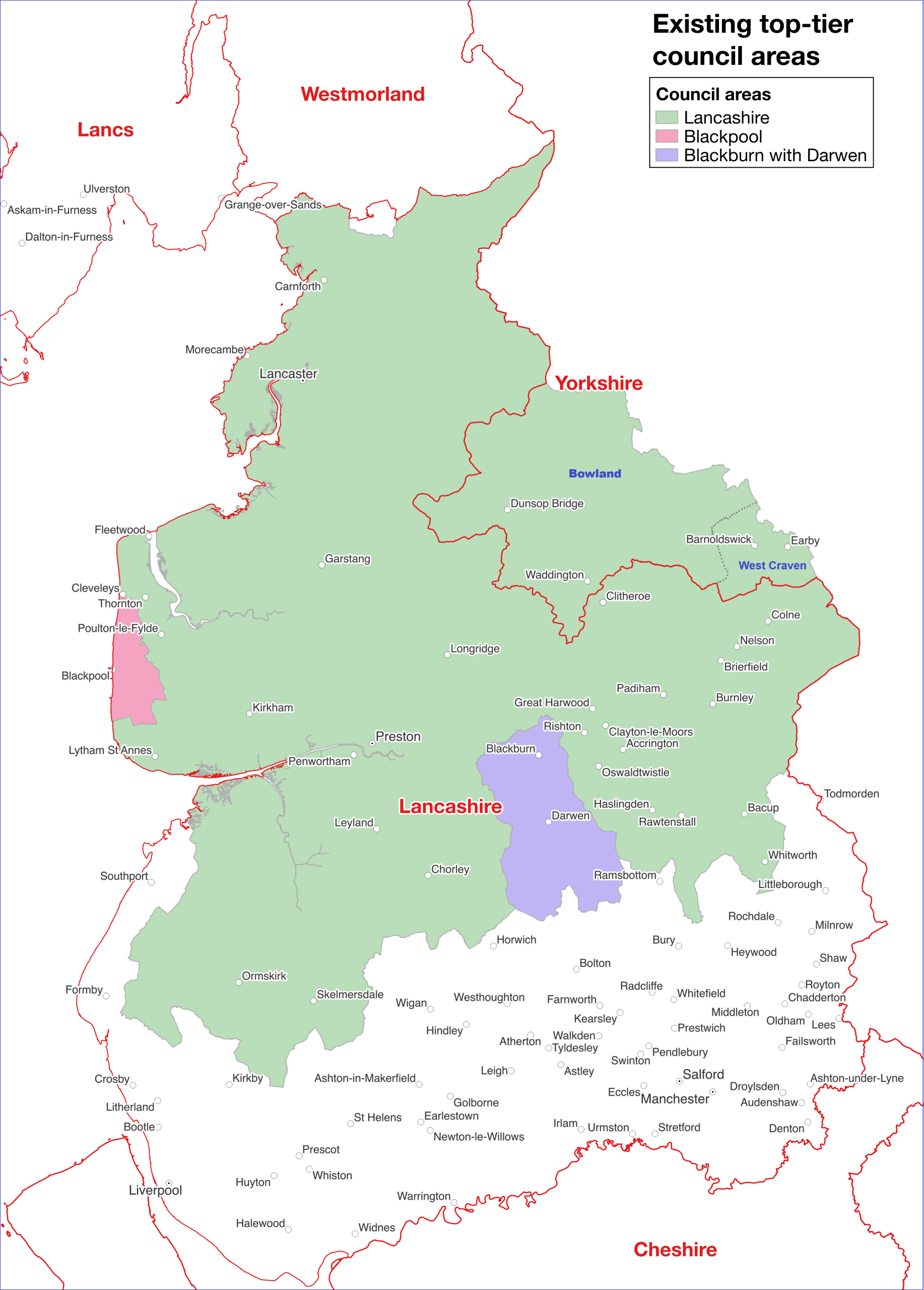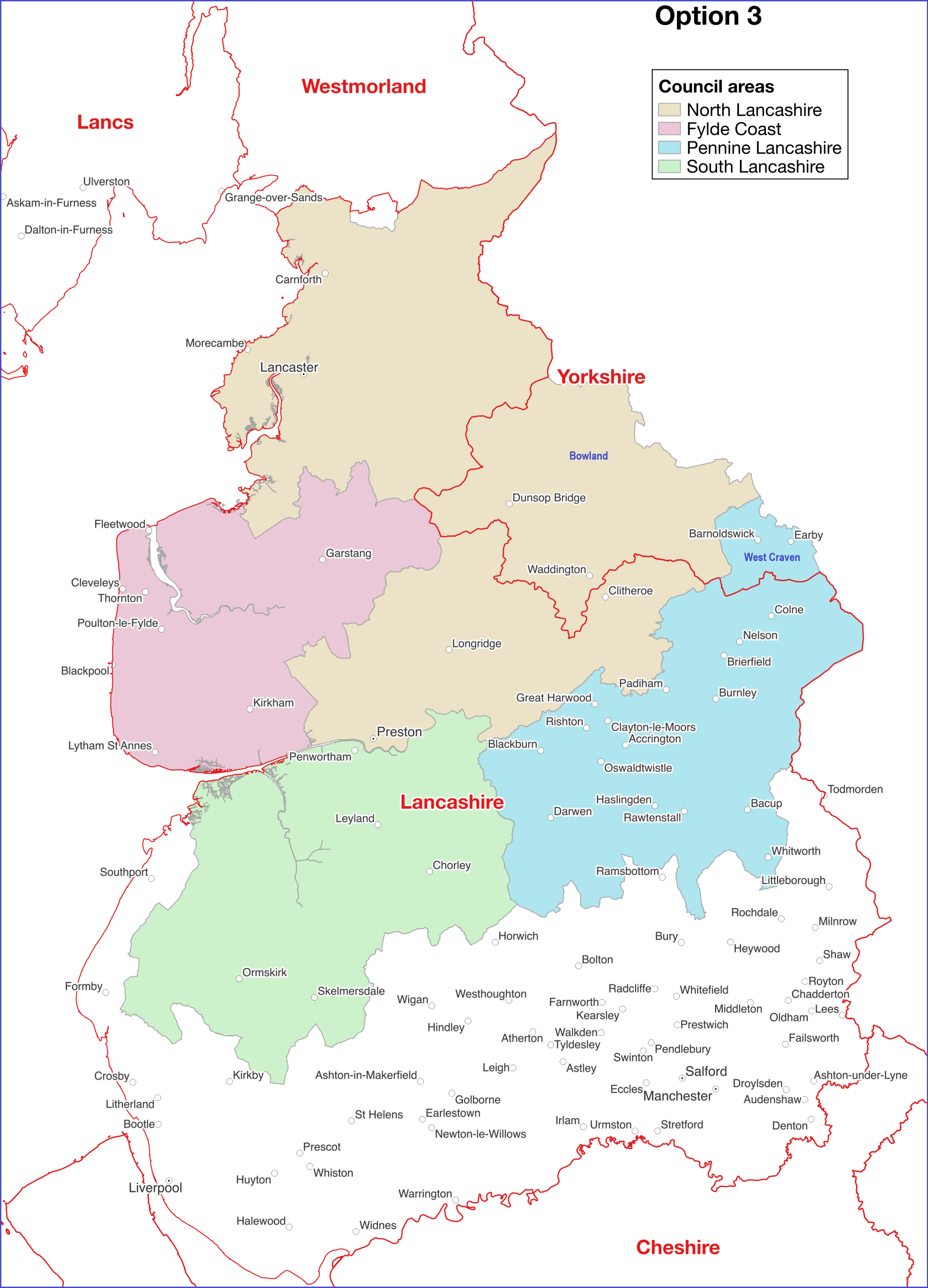 • The “South Lancashire Council” area lies across the centre of Lancashire, not the south. It also includes the West Craven area of Yorkshire. “Central Lancashire and West Craven Council” would be more appropriate.