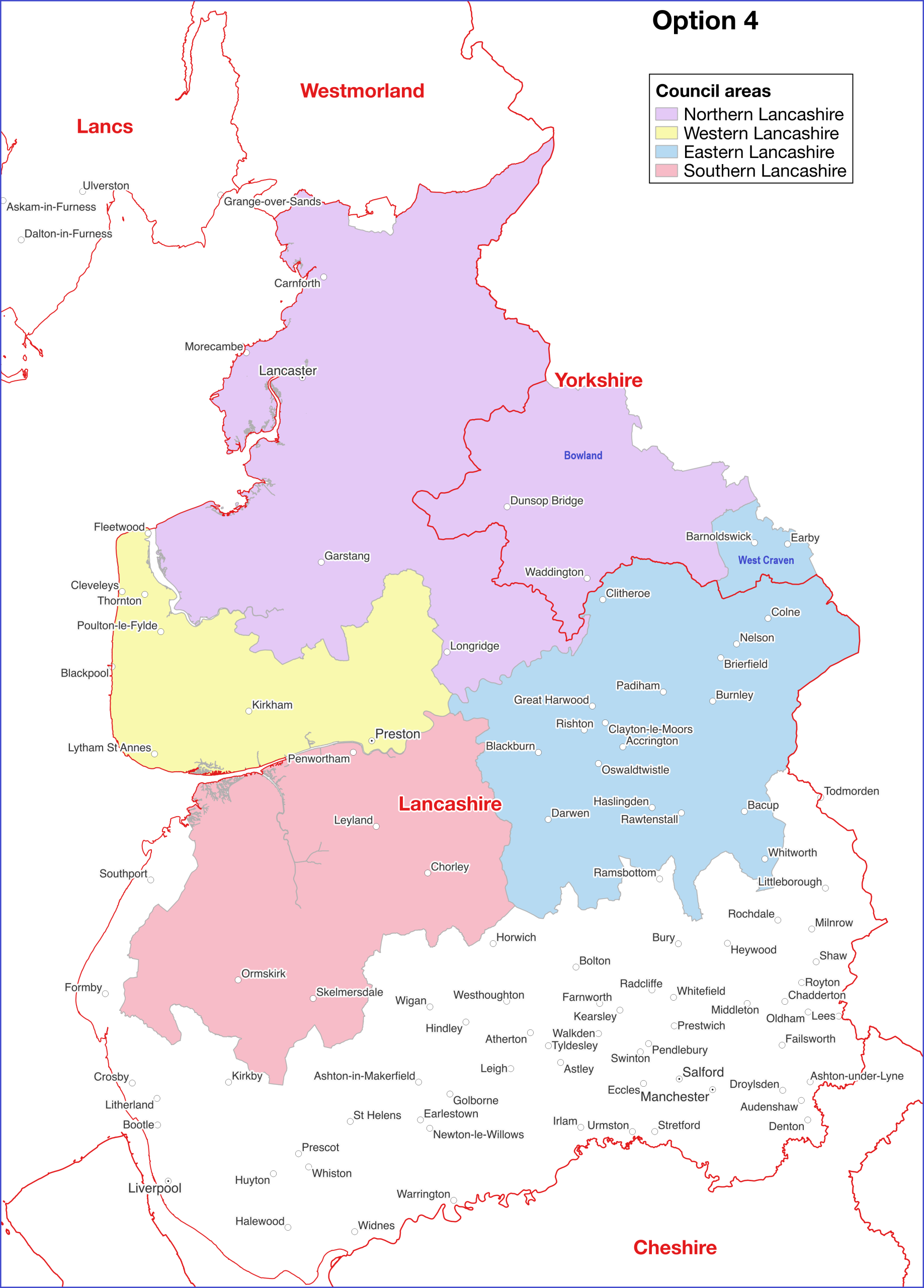 Option 4 from Proposals for local government reorganisation in Lancashire, Blackburn with Darwen and Blackpool