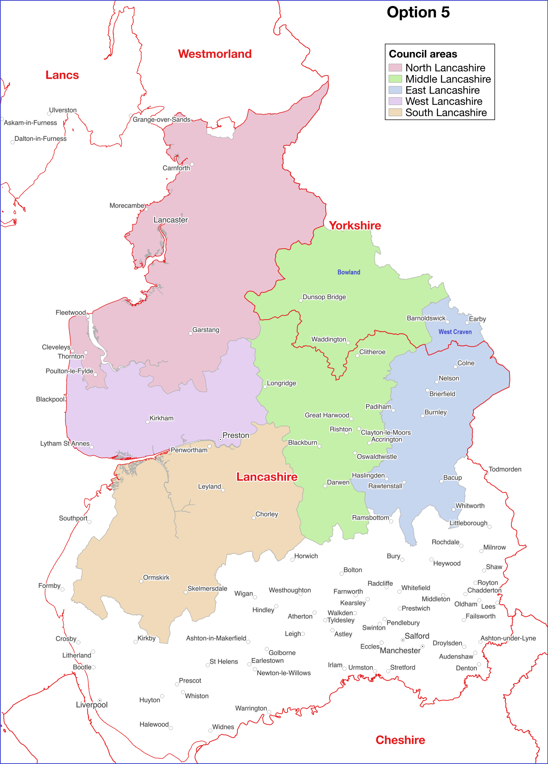 Option 5 from Proposals for local government reorganisation in Lancashire, Blackburn with Darwen and Blackpool