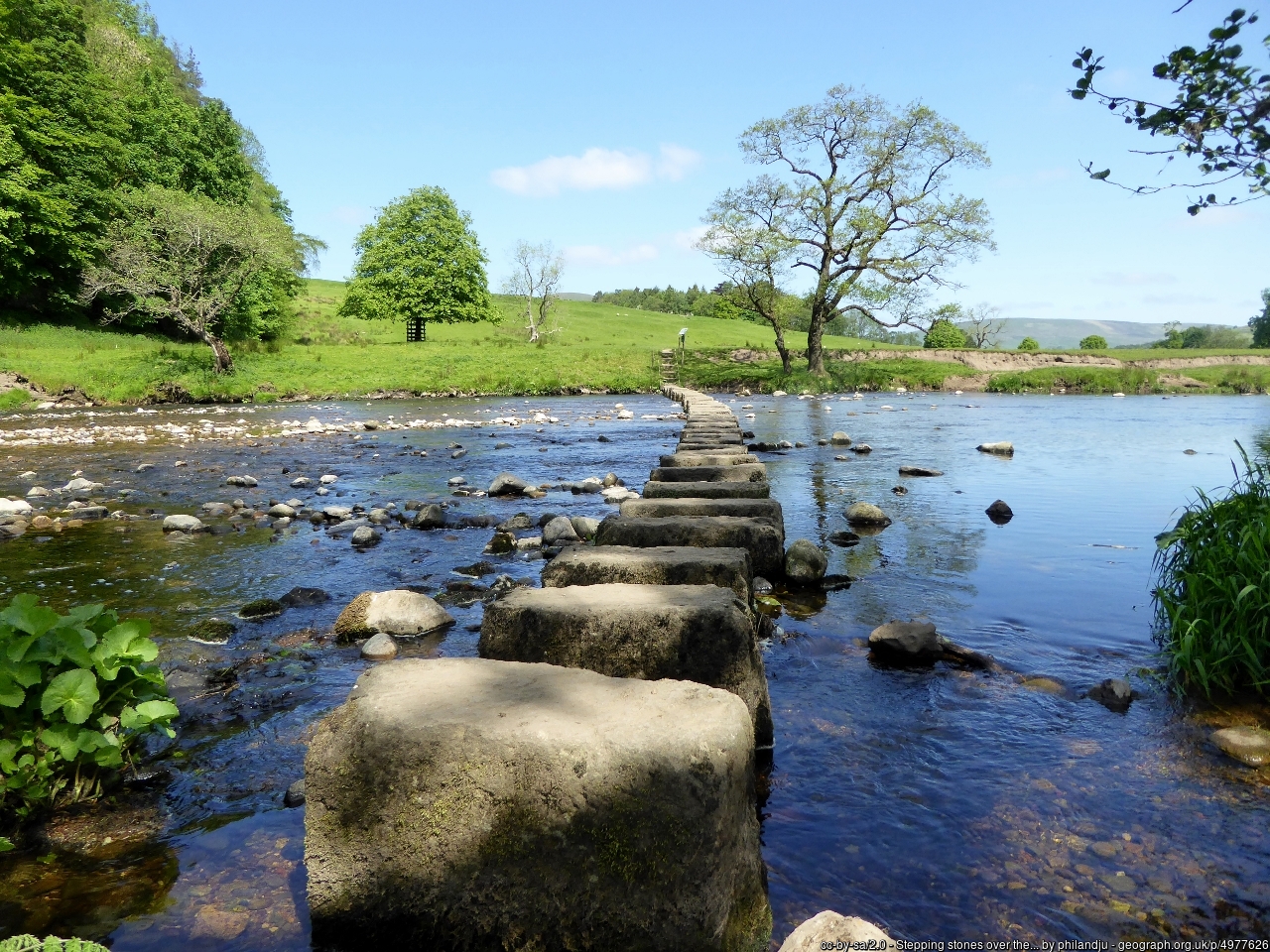 Stepping Stones across the River Hodder crossing from Whitewell in Yorkshire over to Lancashire.
