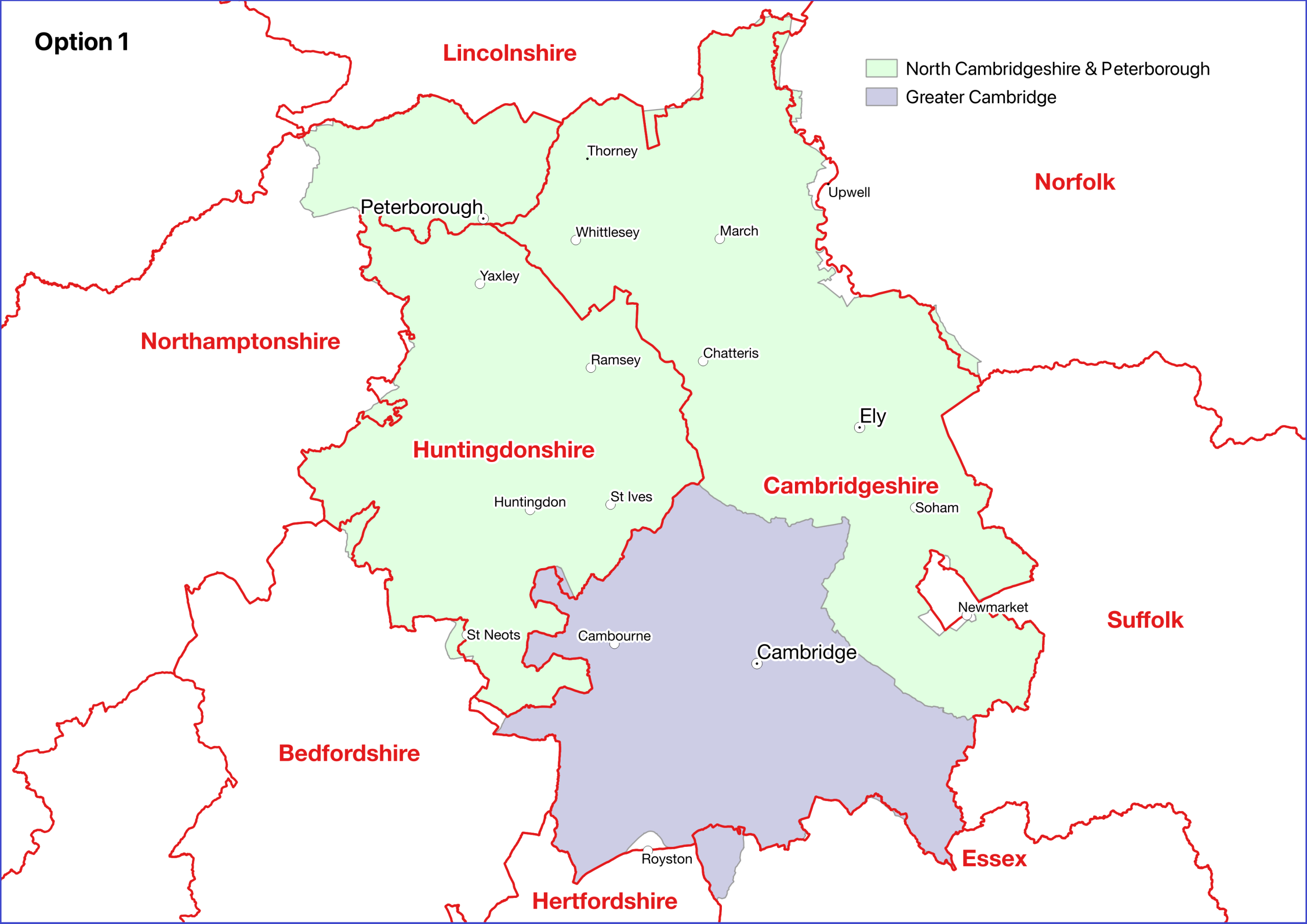 Option 1 for local government reorganisation in the Cambridgeshire and Peterborough council areas.