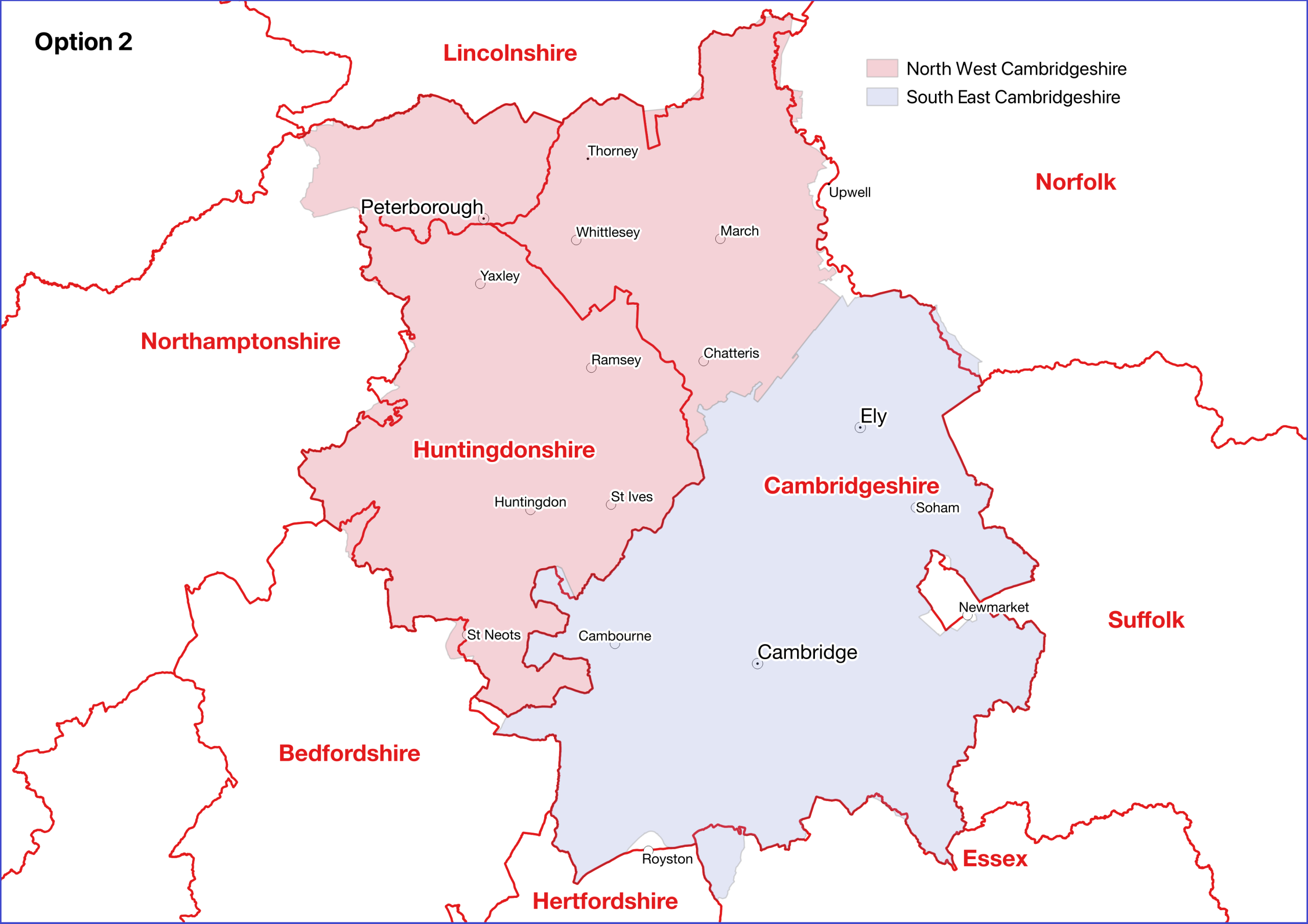 Option 2 for local government reorganisation in the Cambridgeshire and Peterborough council areas.