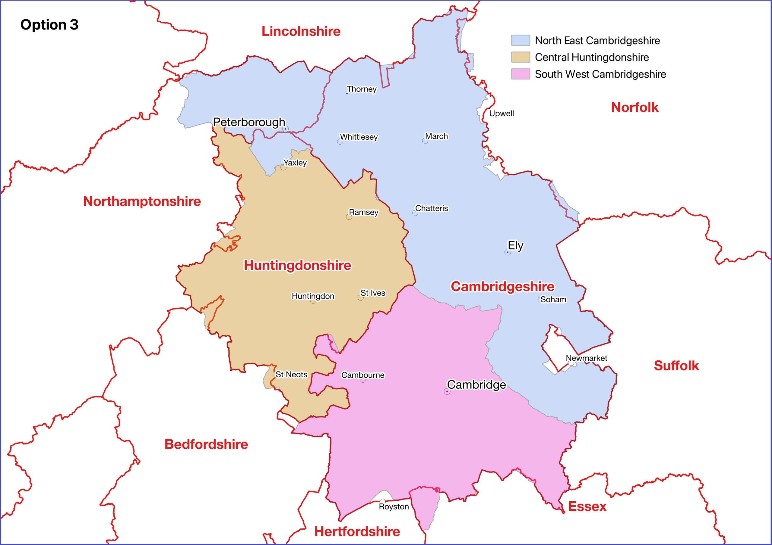 Option 3 for local government reorganisation in the Cambridgeshire and Peterborough council areas.