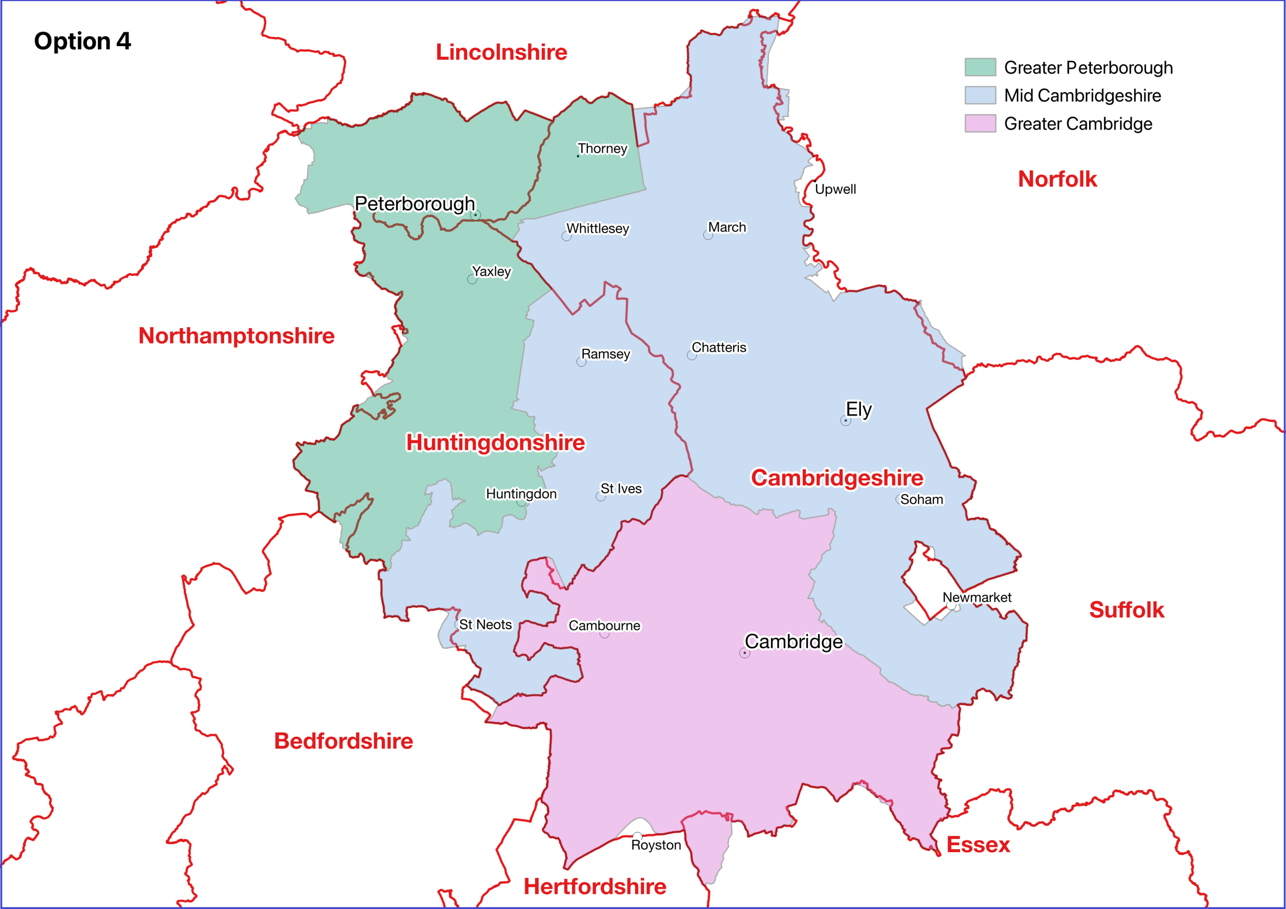 Option 4 for local government reorganisation in the Cambridgeshire and Peterborough council areas.
