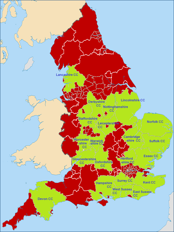 The current local government map of England. The red areas already have unitary local government. The green areas are the remaining two-tier “county council” areas which are to be replaced by unitary local government.