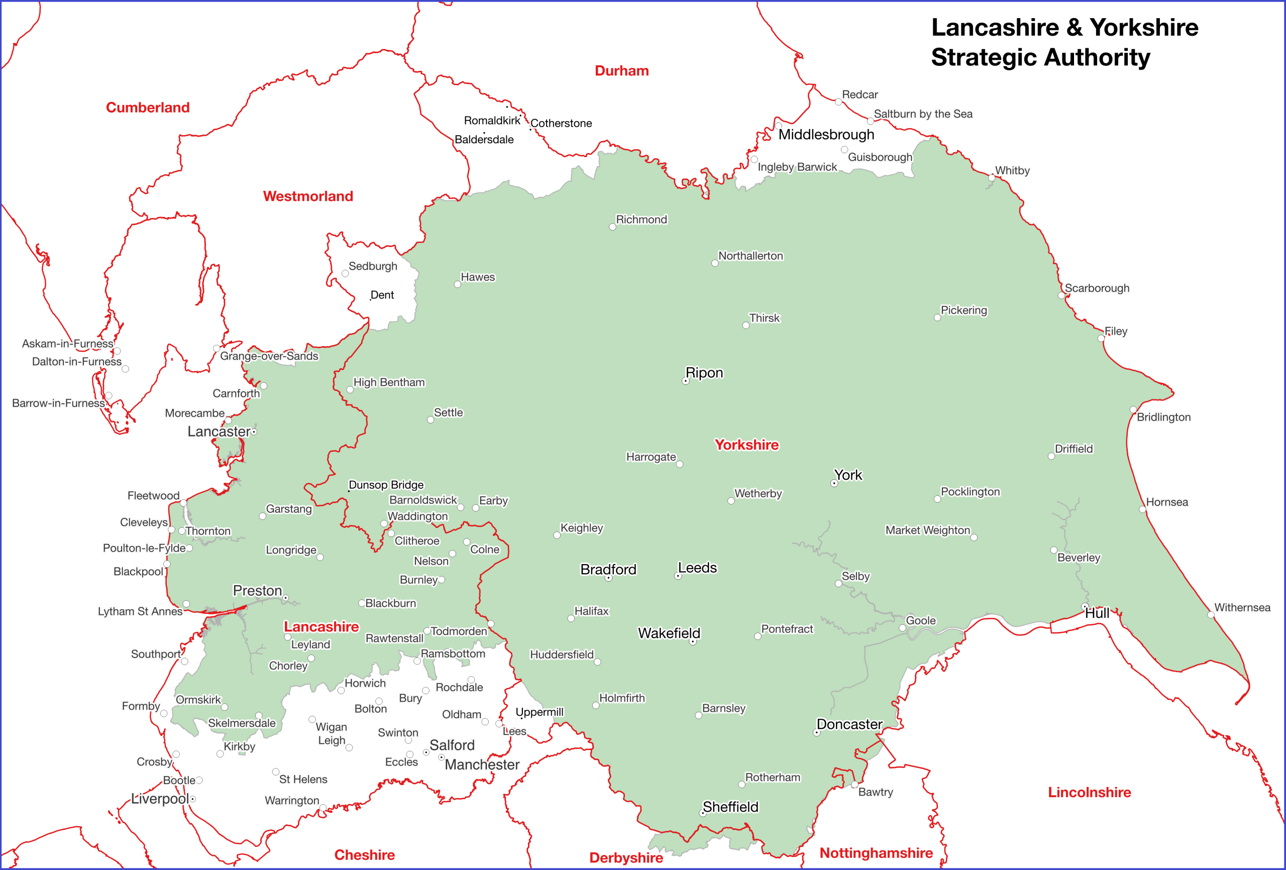 The Government has just announced that the first of the Strategic Authorities will be a huge Lancashire and Yorkshire Strategic Authority. Despite the name, this authority will not cover the real Lancashire and Yorkshire, but the combined area of the present local government areas of Lancashire, West Yorkshire, South Yorkshire, North Yorkshire and East Riding of Yorkshire. There will also be a Mayor of Lancashire and Yorkshire.