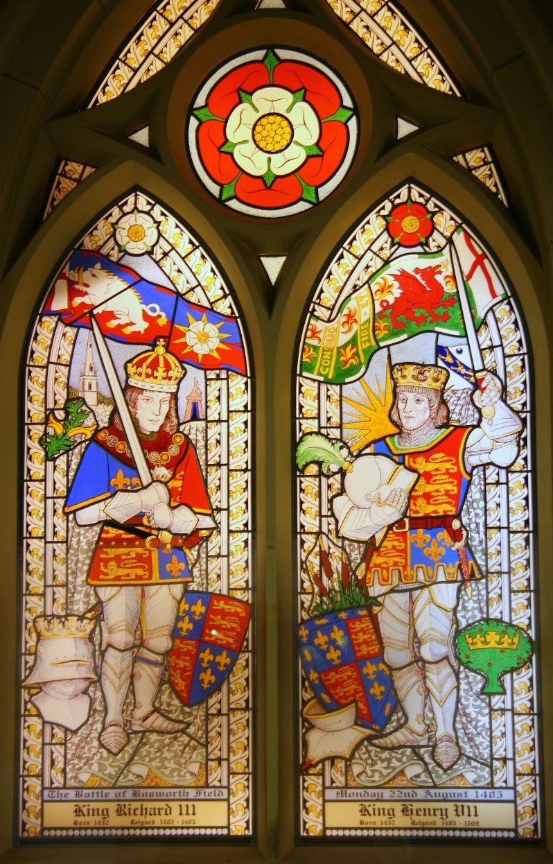 Stained glass window at St James Church, Sutton Cheney depicting Henry VII’s union of the Houses of Lancaster and York and the symbolisation of that union in the Tudor Rose.