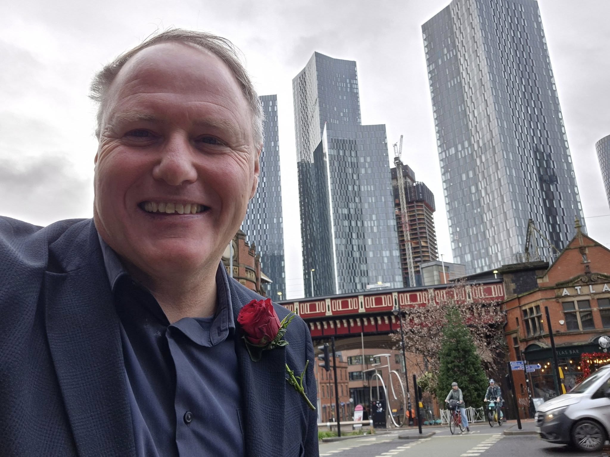 Geoff Molyneux celebrates Lancashire Day 2025 on Deansgate, Manchester.
