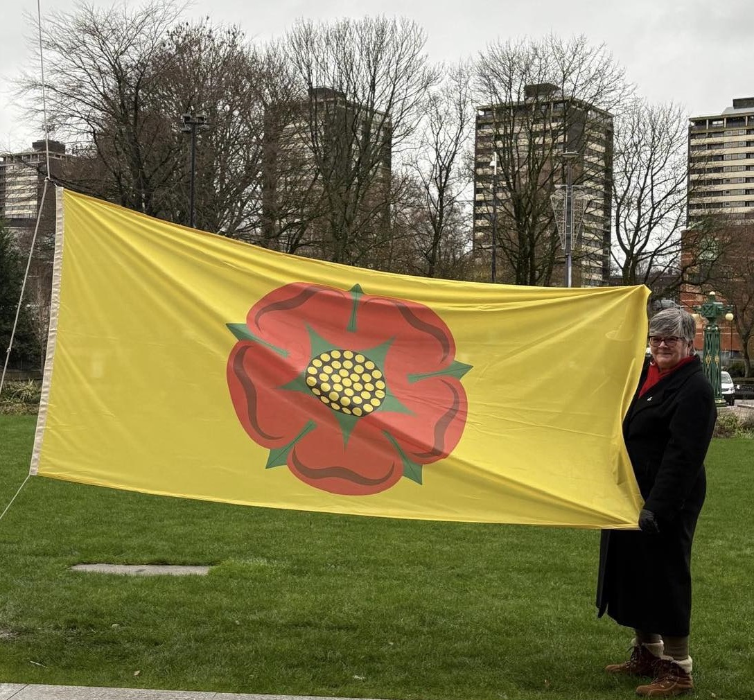 The Mayor of Rochdale, Councillor Janet Emsley, raises the county flag at Rochdale Town Hall on Lancashire Day 2025.