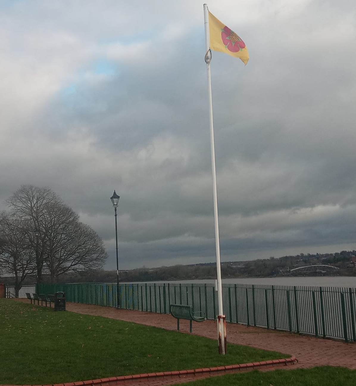 The county flag flies proudly for Lancashire Day 2025 on the north bank of the Mersey at West Bank, Widnes.