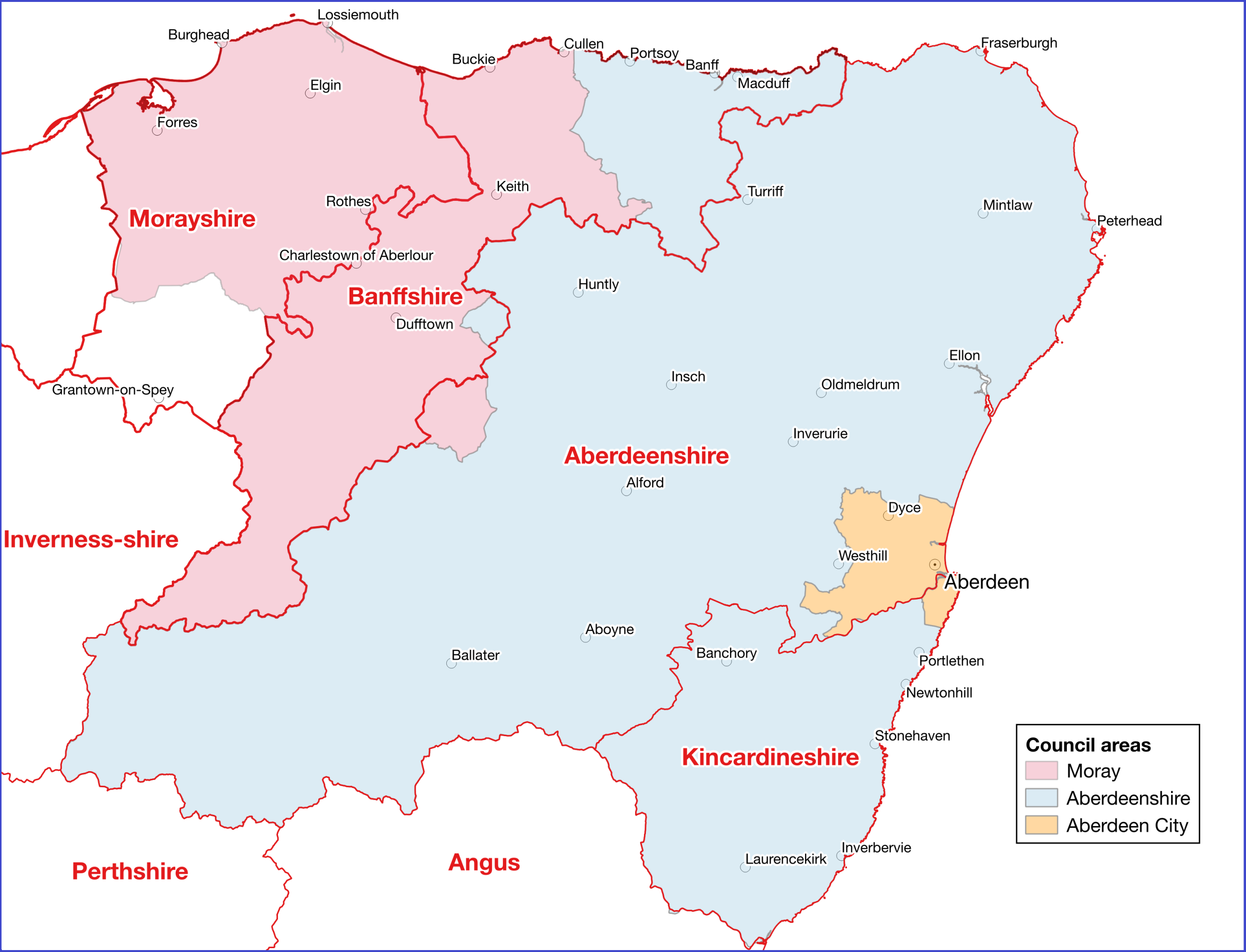 - Aberdeenshire Council does cover most of Aberdeenshire, excluding Aberdeen itself, but it also covers almost the whole of Kincardineshire and a large piece of coastal Banffshire. When a council uses a historic county name but actually covers a large part of a different historic county, this has a terrible effect on public understanding of the historic counties concerned. Our friends in the Kincardineshire Association can bear witness to this. The name “East Grampian Council” may be contrived but it would avoid this county confusion.