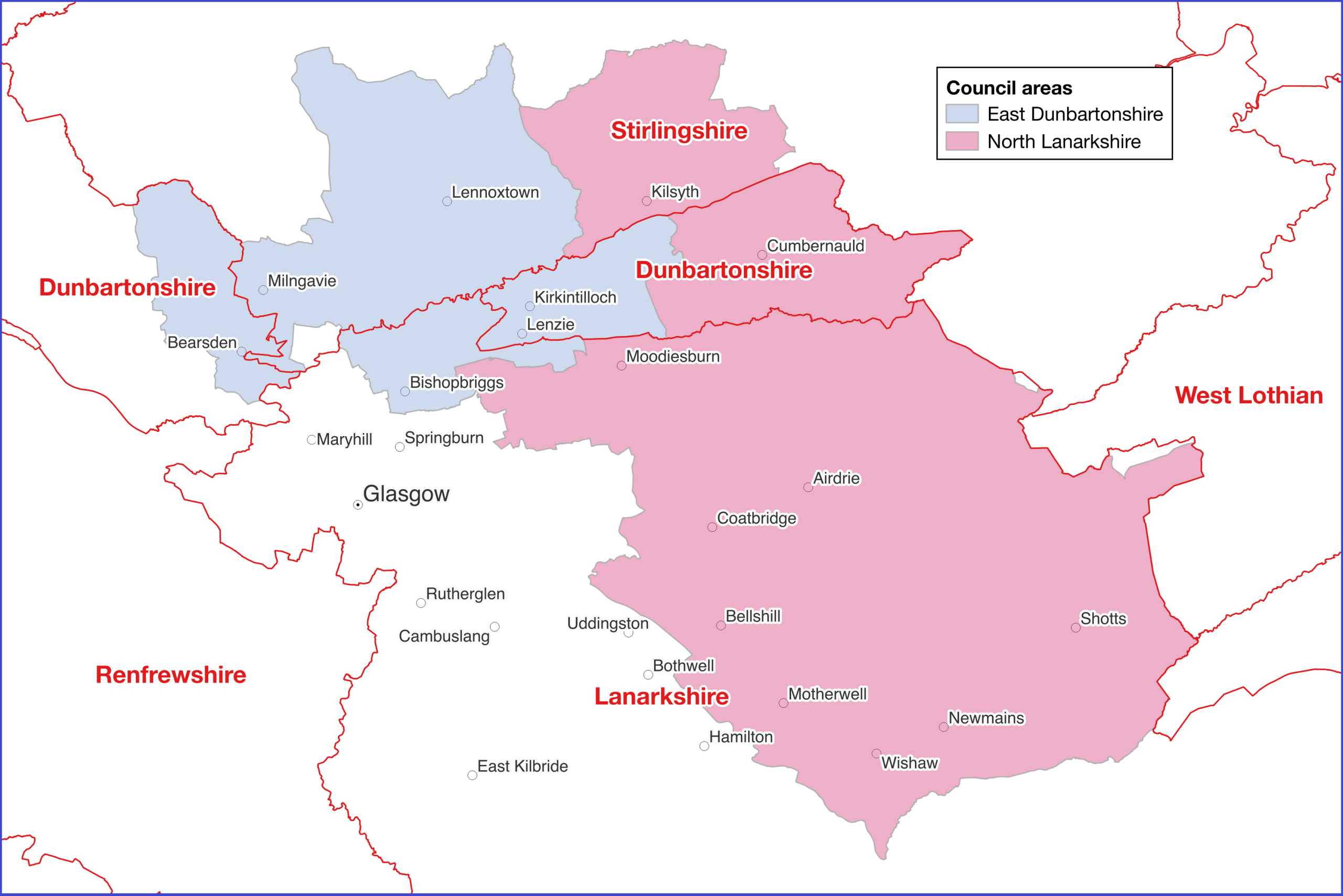 East Dunbartonshire Council was created in 1996 from the abolished districts of Bearsden & Milngavie and Strathkelvin. Its area doesn’t bear even a passing resemblance to the eastern portion of Dunbartonshire. Three-quarters of its area is in Stirlingshire and a sizeable part is in Lanarkshire.