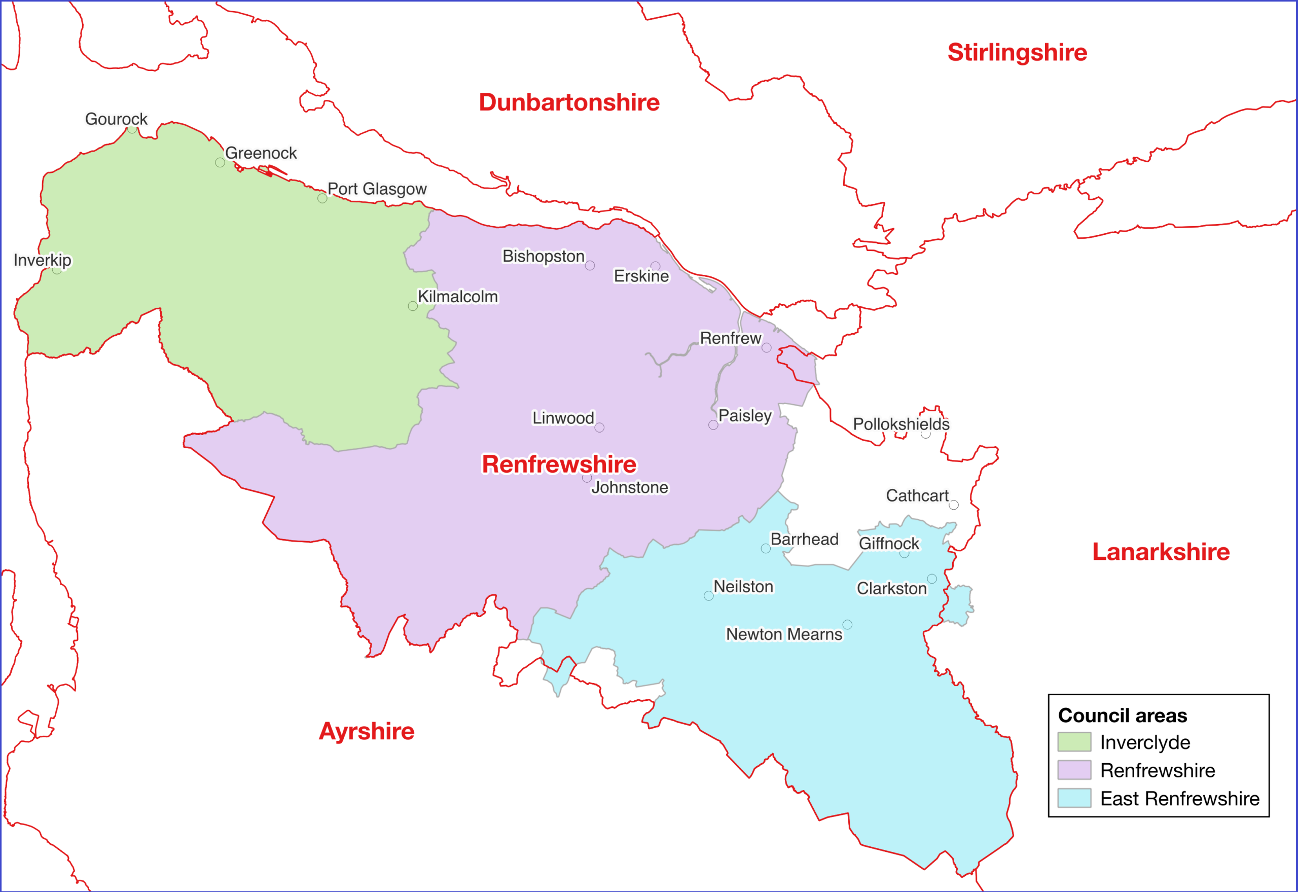 Renfrewshire Council‘s area covers only the central third of Renfrewshire. It was created in 1996 based on the former district of Renfrew. It sits between East Renfrewshire Council and Inverclyde Council. Either “Central Renfrewshire Council” or “Renfrew Council” would be sensible names.