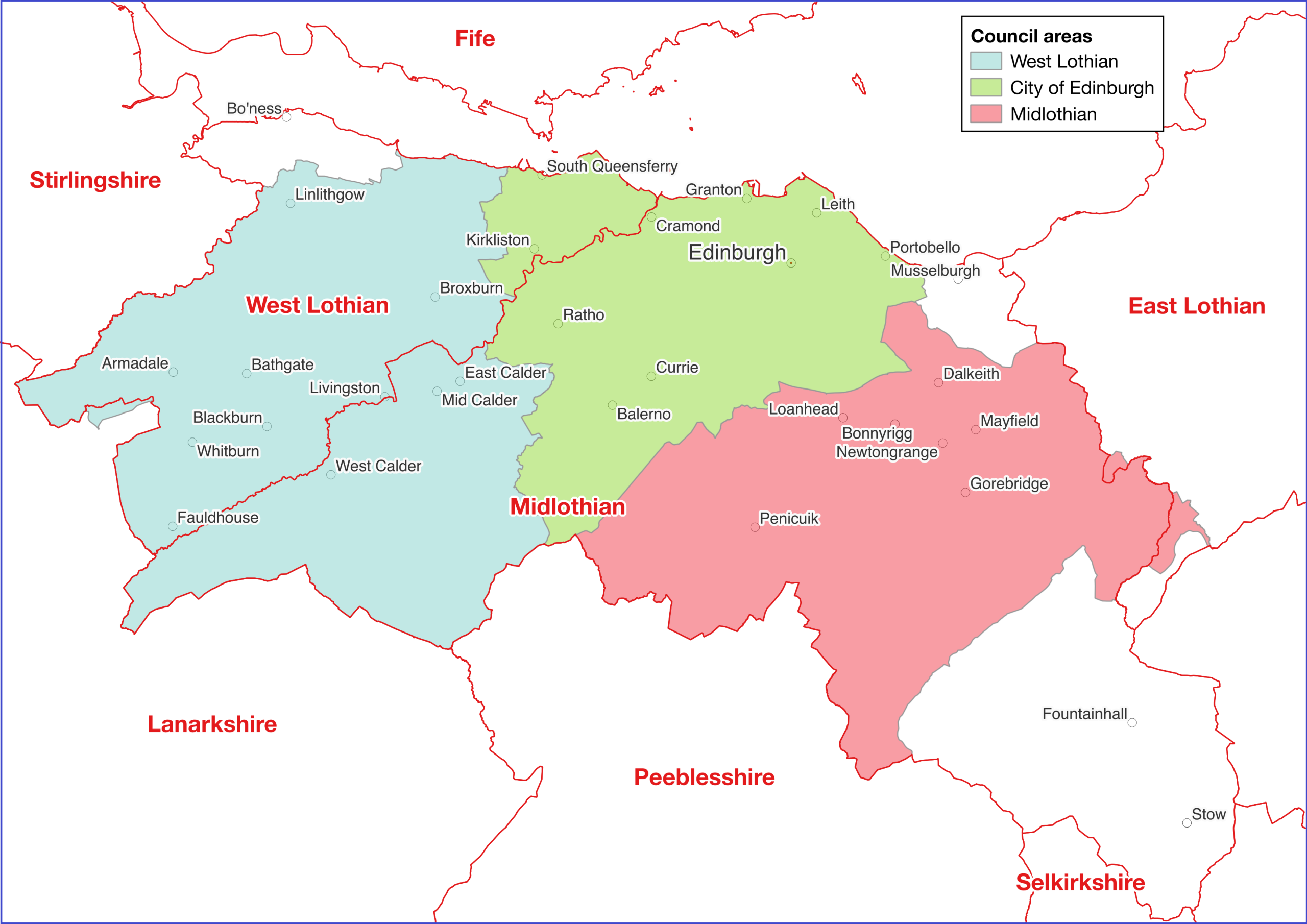 Whilst the City of Edinburgh covers sizeable parts of West Lothian and Midlothian, this is no excuse for the absurd names born by West Lothian Council and Midlothian Council.